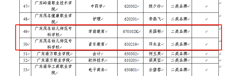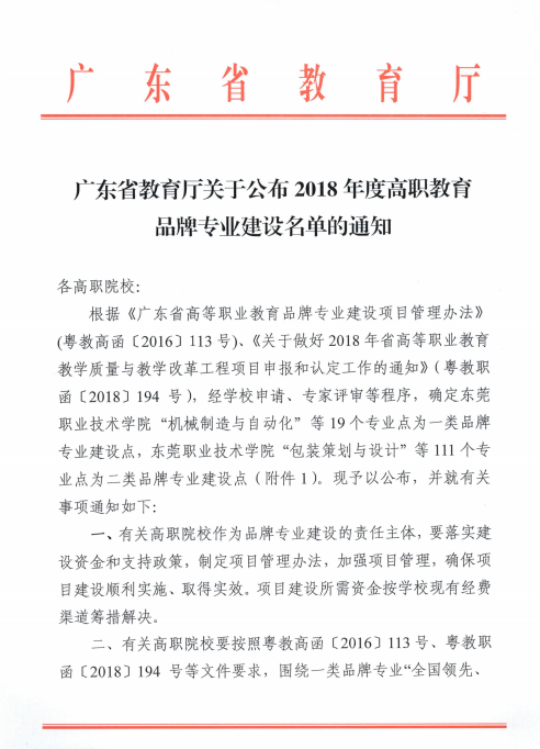 根据《广东省高等职业教育品牌专业建设项目管理办法》 (粤教高函〔2016〕113号)、《关于做好2018年省高等职业教育教学质量与教学改革工程项目申报和认定工作的通知》(粤教职函〔2018〕194 号),经省厅组织专家评审,我校学前教育专业、音乐教育专业被确定为广东省高职教育二类品牌专业。