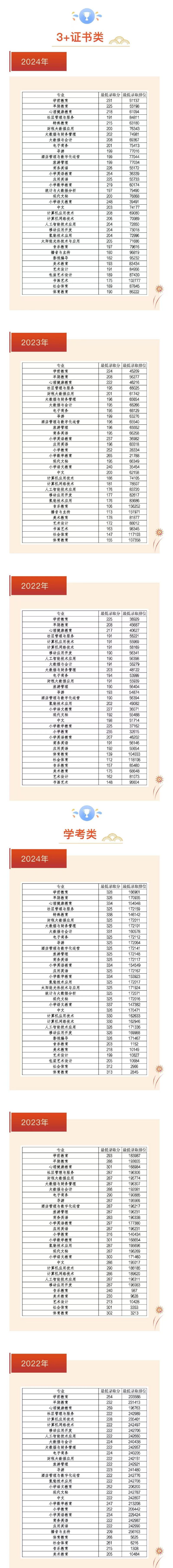 为了帮助考生更好地填报我校志愿,现将我校往年春季高考“3+证书类”、“学考类”各专业录取最低分及排位情况提供给各位考生参考: