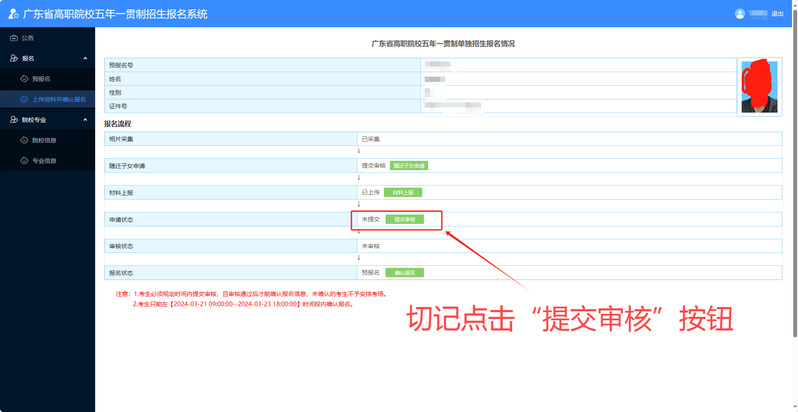 注意:请各位考生务必点击“提交审核”,提交审核后请密切留意审核结果,若结果为撤回修改,请根据审核意见进行修改,若结果为同意,请在规定时间重新登录系统进行确认报名,并根据本公众号后续推文进行缴费流程。
