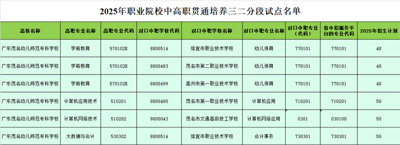 根据《广东省教育厅 广东省招生委员会办公室关于开展2025年职业院校中高职贯通培养三二分段试点工作的通知》(粤教职函〔2025〕15号)精神,2025年,我校与茂名市第一职业技术学校、信宜市职业技术学校等5所中职(中技)阶段学校合作,联合开展中高职贯通培养三二分段试点招生工作。现将我校与5所对口中职(中技)阶段学校的招生专业及计划公布如下: