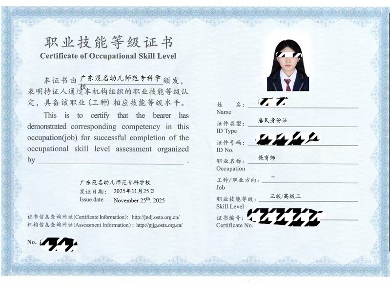 为全面提升学生专业素养与实践能力,精准对接社会对婴幼儿保育教育、健康照护领域的紧缺专业人才需求,经广东省人社厅、茂名市人力资源社会保障局及学校上级部门批准,教育科学学院已在上一学期顺利开展两批次保育师、婴幼儿发展引导员、健康照护师等职业技能等级证书考核工作,为全院学子搭建“以认证促提升、以技能拓路径”的成长平台。2026年度报考通道现已全面开启,诚邀全体同学把握机遇、持证前行。