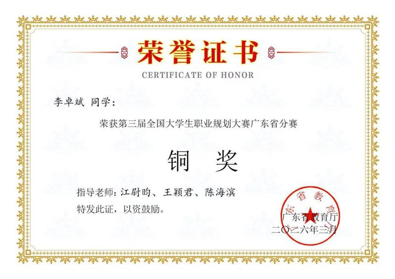 全国职业规划大赛是目前全国规格最高、覆盖面最广、影响力最大的职业规划类赛事。备赛期间,江尉昀、王颖君、陈海滨三位指导老师从职业认知、规划书打磨、答辩模拟等方面全流程精准辅导,倾力护航。李卓斌同学立足旅游管理专业,明确职业方向、细化成长路径,将专业学习与职业理想紧密结合,充分展现了我校学子勤学善思、追求卓越的精神风貌。