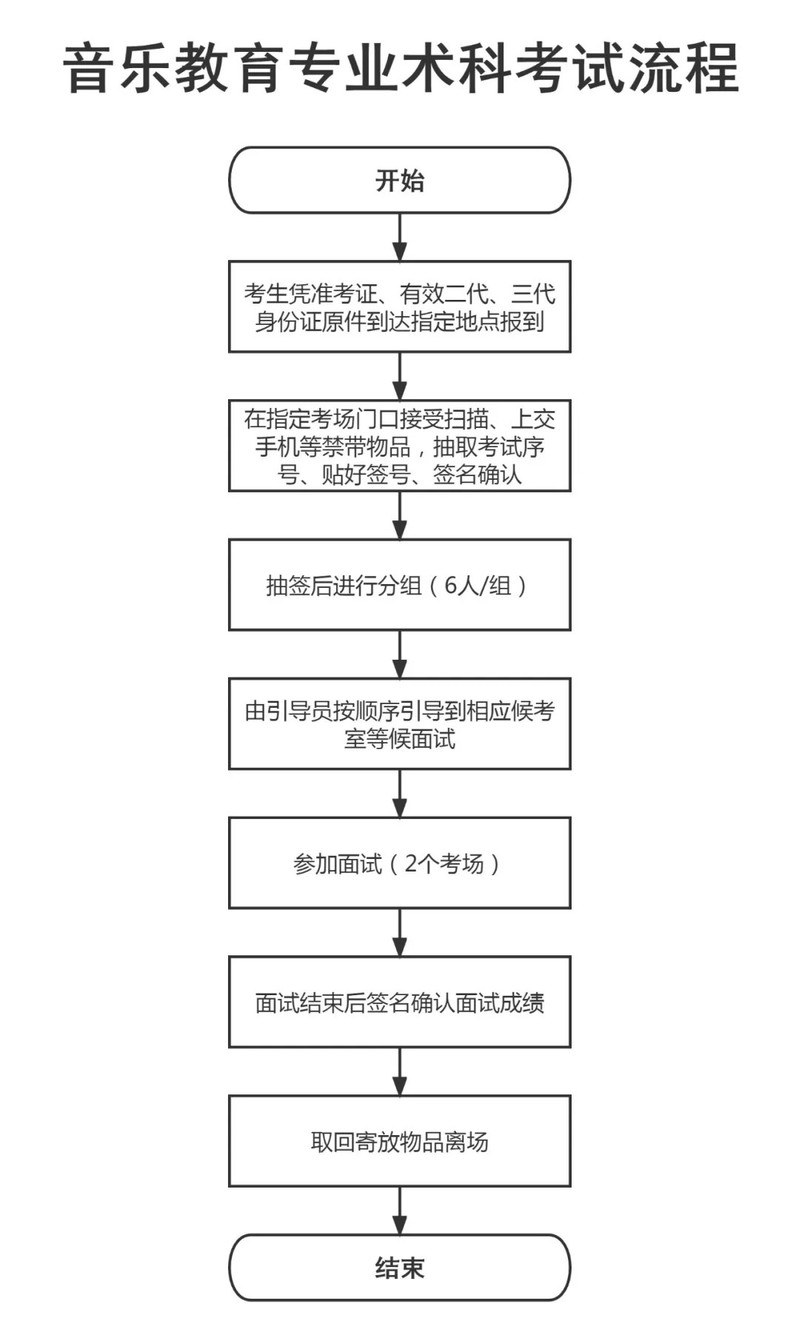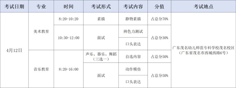 音乐教育术科考试时间:4月12日8:20-16:00,随到随考,如考生晚于16:00到达考场,则不得进入考场参加考试。考生须携带有效身份证、准考证及考试用品按时参加考试,考场仅提供钢琴、G调D调古筝、架子鼓。选考声乐或舞蹈的考生,可自备小型音乐播放器/U盘,考场提供钢琴伴奏(需自带歌谱)。报到地点:实训中心行知2号楼一楼致新厅;咨询电话:0668-3383368。