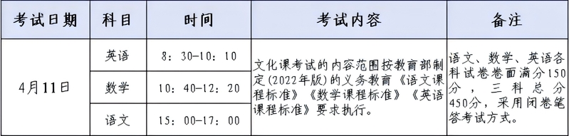 三、4月11日的文化课笔试考试,开考15分钟后,迟到的考生不得入场;考生交卷离场后不得在考场附近逗留。