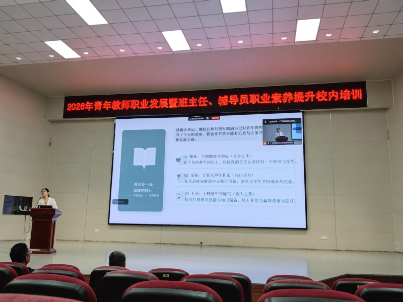 为加强新时代青年教师思想政治工作,助力青年教师职业成长,提升班主任、辅导员职业素养,为学校“十五五”高质量发展夯实师资基础,4月17日,我校组织人事部联合学生工作部、校团委,在茂名校区闻韶苑、高州校区会堂,开展2026年青年教师职业发展暨班主任、辅导员职业素养提升校内培训,全校40岁以下青年教师参与培训。学校党委专职副书记吴月明出席并作总结发言。学生工作部负责人主持会议。